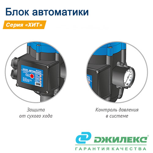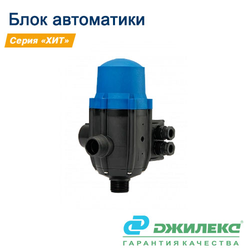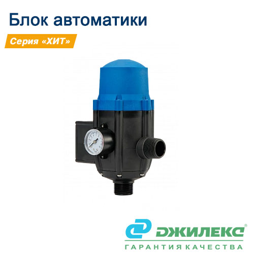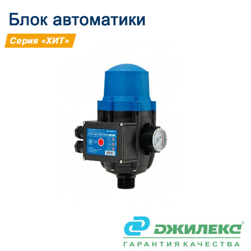 Блок автоматики ХИТ производства компании ТД Джилекс (Россия) предназначен для автоматического регулирования работы насоса и защищает его в случае отсутствия воды (сухой ход). Помимо этого, электроника запускает электронасос при снижении давления в системе, когда открываются краны, а также останавливает его, когда вода прекращает движение, когда краны закрываются. Блок автоматики комплектуется манометром, для зрительного контроля общего давления в системе, и реле давления.