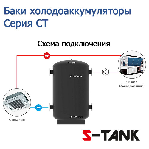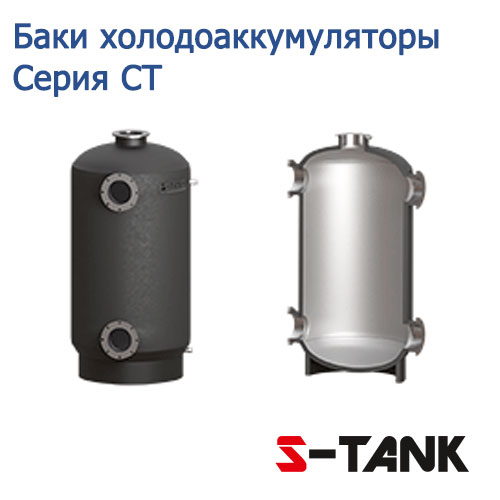 Бак предназначен для аккумулирования холодных жидкостей от различных источников, и построения систем холодоснабжения. Его отличительной чертой является наличие фланцевых подключений большого размера (от ДУ 50 до ДУ 300) (опционально можно заказать резьбовые патрубки). Бак S-TANK серии СT улучшает гибкость системы охлаждения, и является гидравлическим разделителем контуров системы.