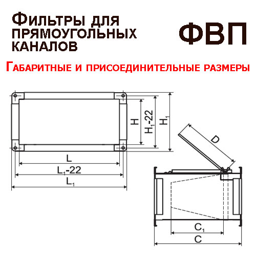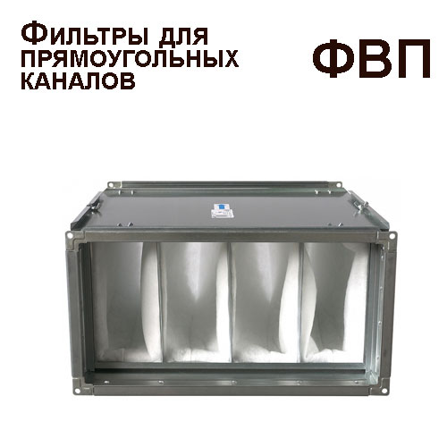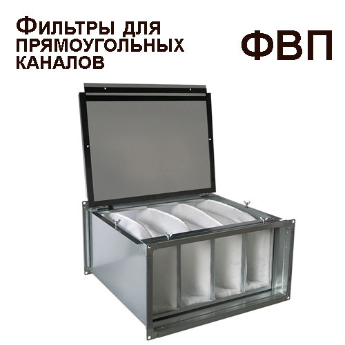 Фильтры для прямоугольных каналов ФВП могут быть установлены на горизонтальных и вертикальных участках воздуховодов. Крышка крепится к корпусу гайкой барашковой оцинкованной. Корпус фильтра ФВП снабжен шинорейкой для присоединения воздуховодов или компонентов вентиляционной системы. Фильтрующий материал выполнен в виде сменной кассеты с мешочными фильтрами из синтетического волокна и имеет класс очистки EU3, EU4, EU5, EU7, EU9.