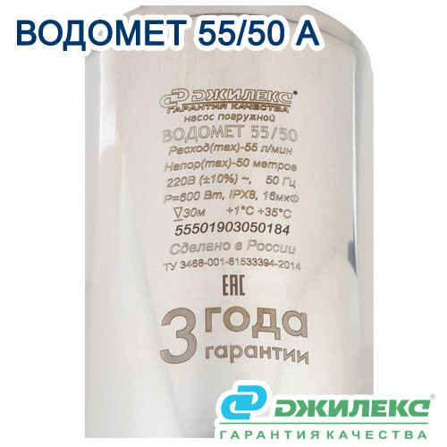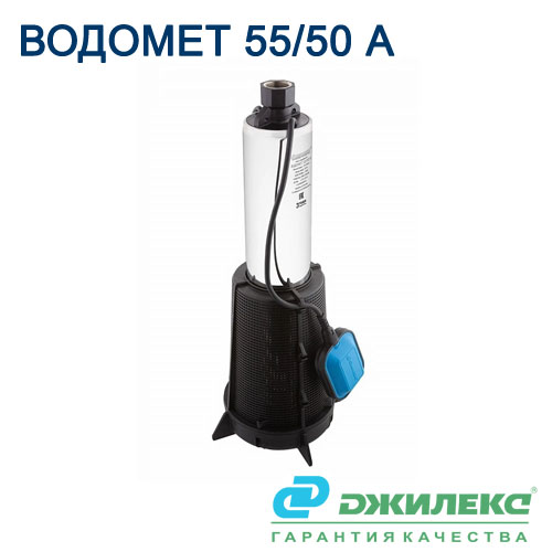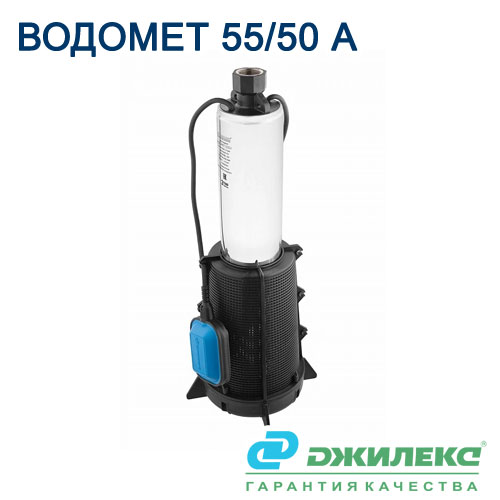 ВОДОМЕТ 55/50 А — колодезный насос с поплавковым выключателем, обладает максимальным расходом 55 л/мин (при свободном изливе, без подпора) и максимальным напором 50 метров (при закрытом кране). Диаметр насоса составляет 98 мм, а донного фильтра 250 мм.