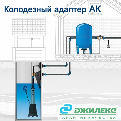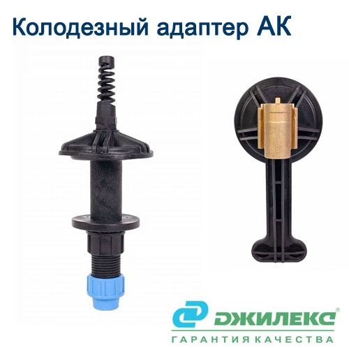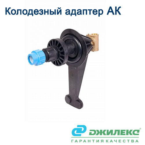 Адаптер колодезный АК производства компании ТД Джилекс (Россия) является готовым решением герметичного ввода напорной магистрали и сетевого кабеля в колодец через бетонное кольцо на глубине ниже уровня промерзания. Облегчает монтаж напорной магистрали от насоса к напорной магистрали из дома.