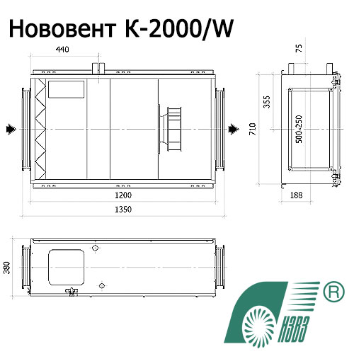 Компактная установка Нововент К-2000 — установка для обработки воздуха состоящая из фильтра нагревателя и вентилятора. Производительность установки до 2000 м3/час. Корпус вентилятора оцинкованная сталь, шумоизолированный, толщина стенок — 25 мм. Рабочее колесо стальное. В качестве фильтрующего элемента применяется плоский фильтр класса очистки G4. Система автоматического управления встроена в установку. Имеется выносная панель с жидкокристаллическим дисплеем.