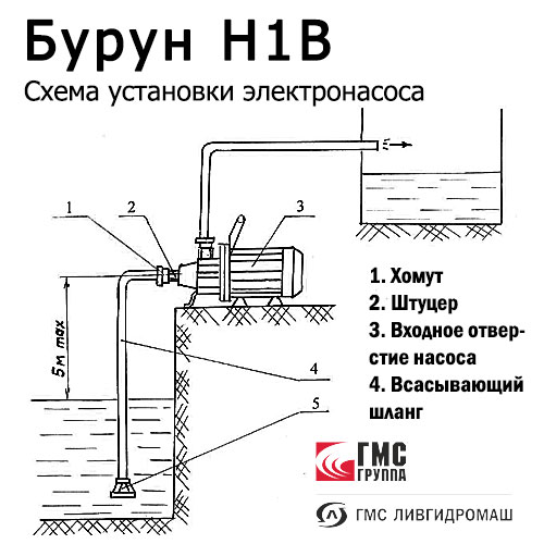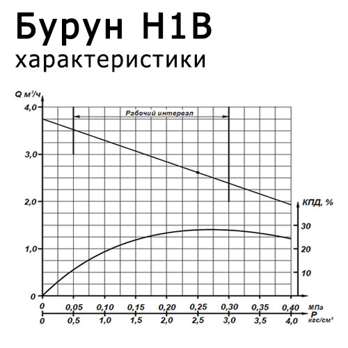 - Электронасос Бурун Н1В предназначен для перекачивания воды температурой до 35°С, а также жидкостей, содержащих механические примеси по массе до 5 % и размером до 2 мм.