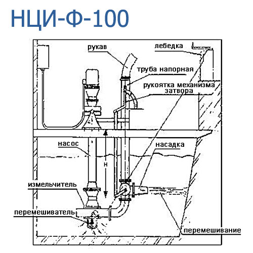 Насос НЦИ-Ф-100 — центробежный с рабочим колесом полуоткрытого типа, с приводом от электродвигателя. Измельчающее устройство — двухступенчатое ножевого типа. Способ перемешивания — механический (винтом) или гидромеханический (дополнительно струей жидкости из насадки). Насос комплектуется лебедкой для поднятия и опускания в приемник. Насос эксплуатируется в стационарном положении (вертикальном или наклонном) после монтажа над приемником.