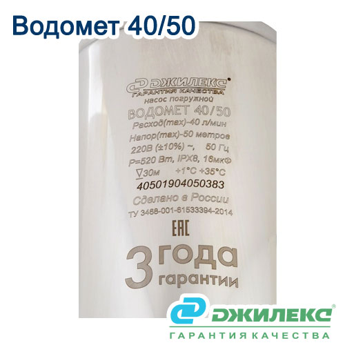 Погружной насос Водомет 40/50 производства компании ТД Джилекс (Россия) для подачи чистой воды из скважин (с внутренним диаметром от 110 мм и более), колодцев, резервуаров и открытых водоемов, для комплектации систем автоматизированного водоснабжения дома и орошения.