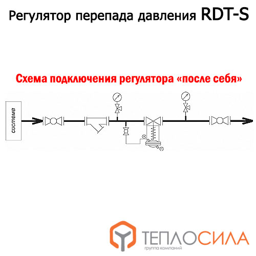 Регуляторы давления прямого действия «до себя» RDT-S производства «Теплосила» предназначен для поддержания постоянного давления в трубопроводе до регулятора (по ходу движения рабочей среды) во всей системе технологической установки. Клапан регулятора при отсутствии сигнала (энергии) нормально закрыт. При повышении давления до регулятора клапан открывается. Не подходит для работы в тупиковых схемах.
