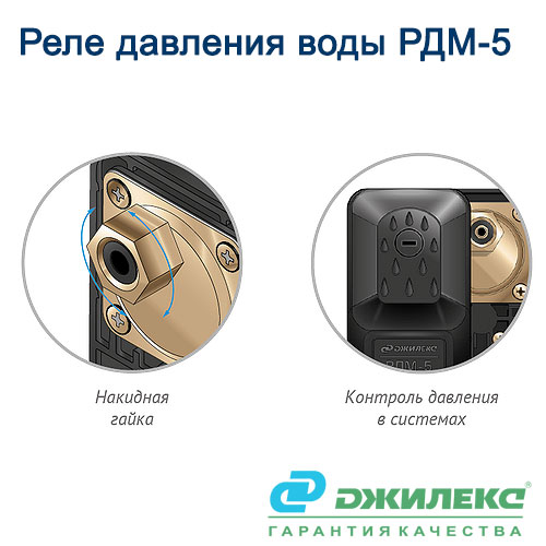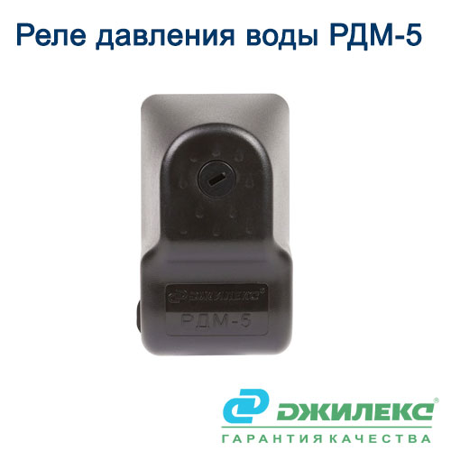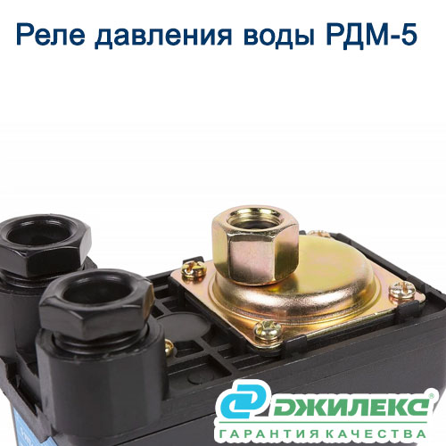 Реле давления РДМ-5 для скважинного насоса производства компании ТД Джилекс (Россия) управляет его работой. Оно автоматически включает насос в момент понижения давления воды в системе водоснабжения до установленного предела, а также останавливает электронасос при превышении верхнего предела настройки.