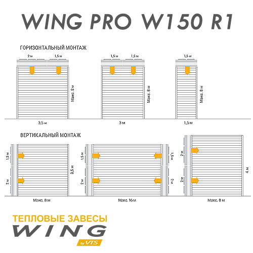 Преимущества воздушной завесы WING PRO: за счет недопущения наружного воздуха в помещение защита температурных условий в помещении, снижение затраты на поддержание микроклимата в помещении, универсальный размер, возможность работы в вертикальном и горизонтальном положении, быстрый, лёгкий монтаж.