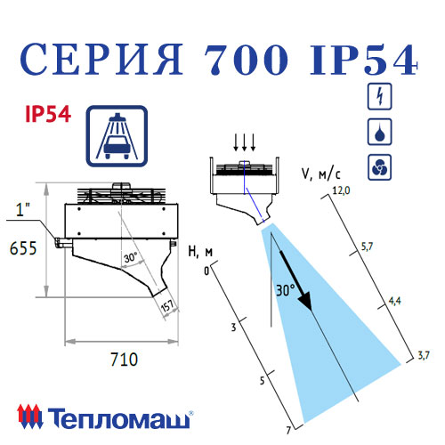 Стандартные завесы серии 700 IP54 из оцинкованной стали с угол сопла 0°, под заказ оцинкованные завесы с углом сопла 30°, или корпус завес из нержавеющей стали с углом сопла 0° или 30°.