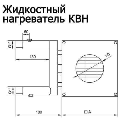 Корпус нагревателя КВН изготовлен из оцинкованной стали. Трубки теплообменника изготовлены из меди с алюминиевым оребрением. Шаг оребрения 2,1 мм. Подключения квадратных нагревателей КВН к воздуховодам круглого сечения осуществляется с помощью адаптеров из оцинкованной стали. Патрубки для подвода теплоносителя для соединения с системой теплоснабжения имеют внешнюю резьбу. Сверху и снизу патрубков имеются пазы для установки устройств для слива воды и удаления воздуха из системы. В качестве теплоносителя могут использоваться как вода, так и различные незамерзающие смеси. Для нормальной работы теплообменника необходимо предусматривать защиту от замерзания. Защита от замерзания осуществляется с помощью шкафа автоматического управления (ШСАУ) и имеет две ступени. Первая ступень непрерывно контролирует температуру обратного теплоносителя с помощью накладного датчика температуры. Вторая ступень реализуется с помощью термостат защиты от замерзания по воздуху. Регулировка температуры приточного воздуха осуществляется с помощью шкафа автоматического управления (ШСАУ) и водосмесительного узла (УВС). Нагреватель КВН допускается использовать внутри помещения в положении, позволяющем провести отвод воздуха. Расстояние от нагревателя до следующего элемента вентиляционной сети должно быть не менее диагонали теплообменника.